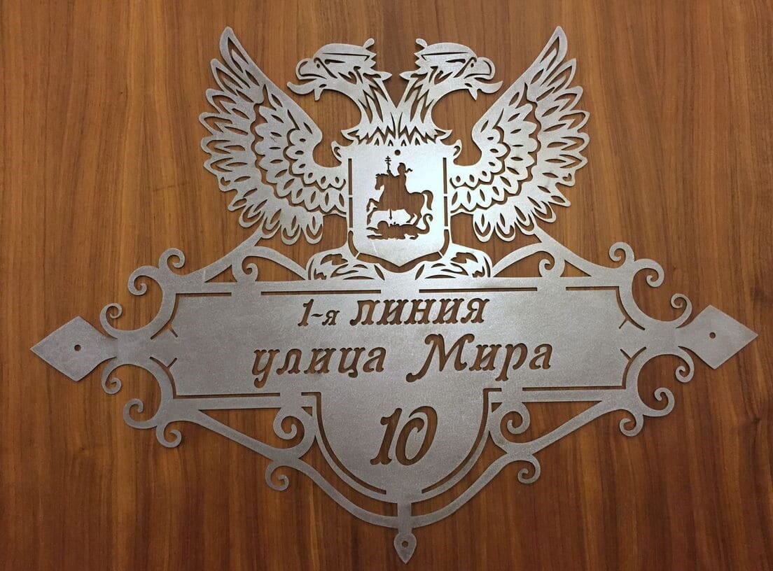 Настоящее украшение фасада вашего дома — адресная табличка из металла с лазерной резкой! Она может быть настоящим произведением искусства — дизайн, разработанный с учётом всех ваших пожеланий, с металлическим витиеватым узором или силуэтами животных, птиц, растений — фантазии нет границ. От вас необходим только адрес, тематика и размер таблички. Всё остальное мы сделаем сами!
